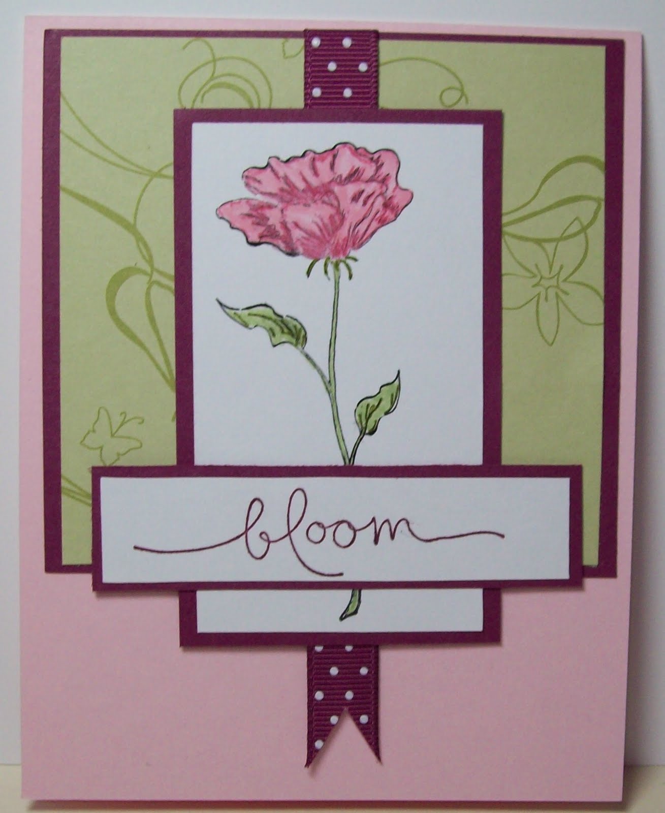 I used pink pirouette as my base, then used rich razzleberry as my mat. The dsp is from SU Cottage Grove collection. I added the rich razzleberry ribbon.
